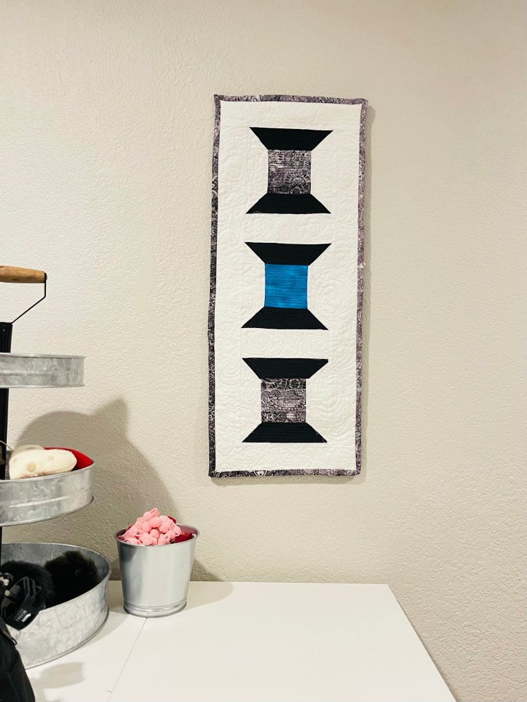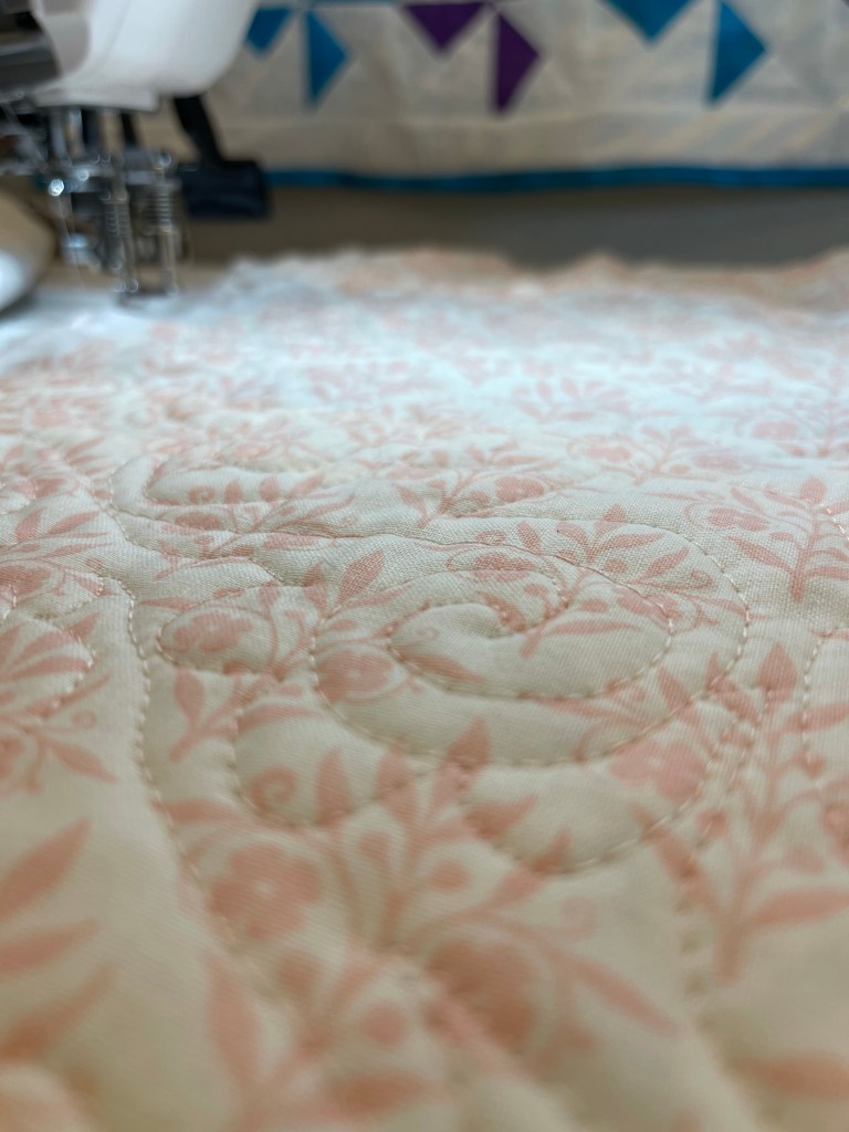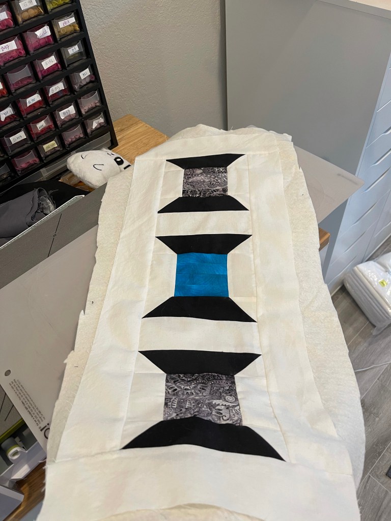 Next, lay down a piece of the background vinyl over that placement stitch so that the vinyl completely covers the placement stitching. You need enough to be able to cut a nice 1/8″ or 3-4 mm border after you are done stitching.