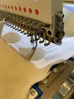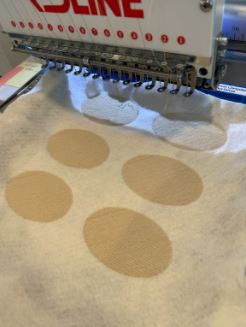 Replace the hoop back on the machine, and run the placement stitch for the eyelet area. Then run the final outline, which secures the front and back together and hides the stitching in between the layers.
